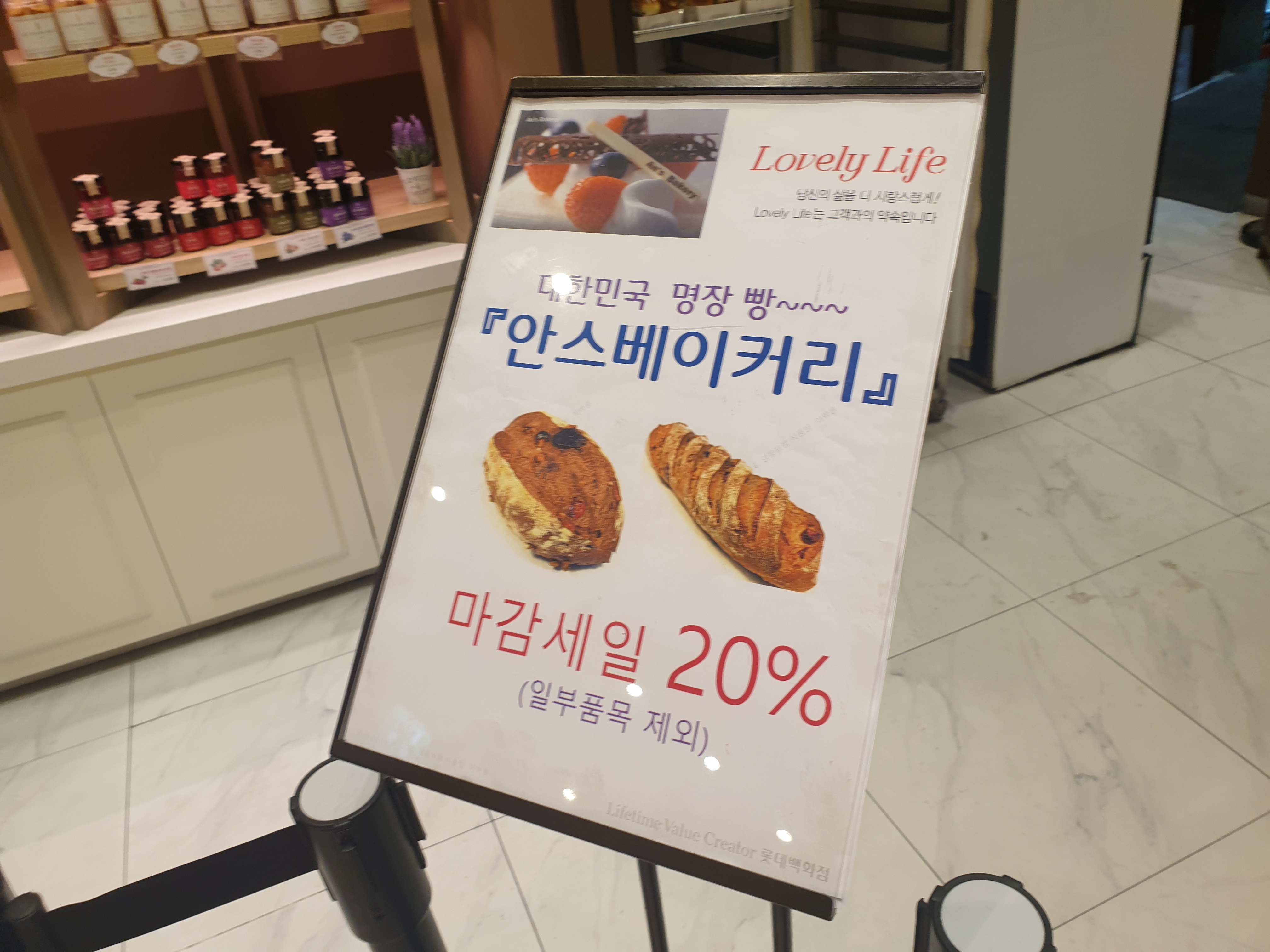 저는 저녁시간인 오후7시반쯤 방문했었는데요 마감시간이라 그런지 20퍼센트 할인하는 빵들이 있어서 좋았어요. 마감시간 직전에 백화점에 가면 빵집아니더라도 할인하는 품목이 많아서 참 좋아요.