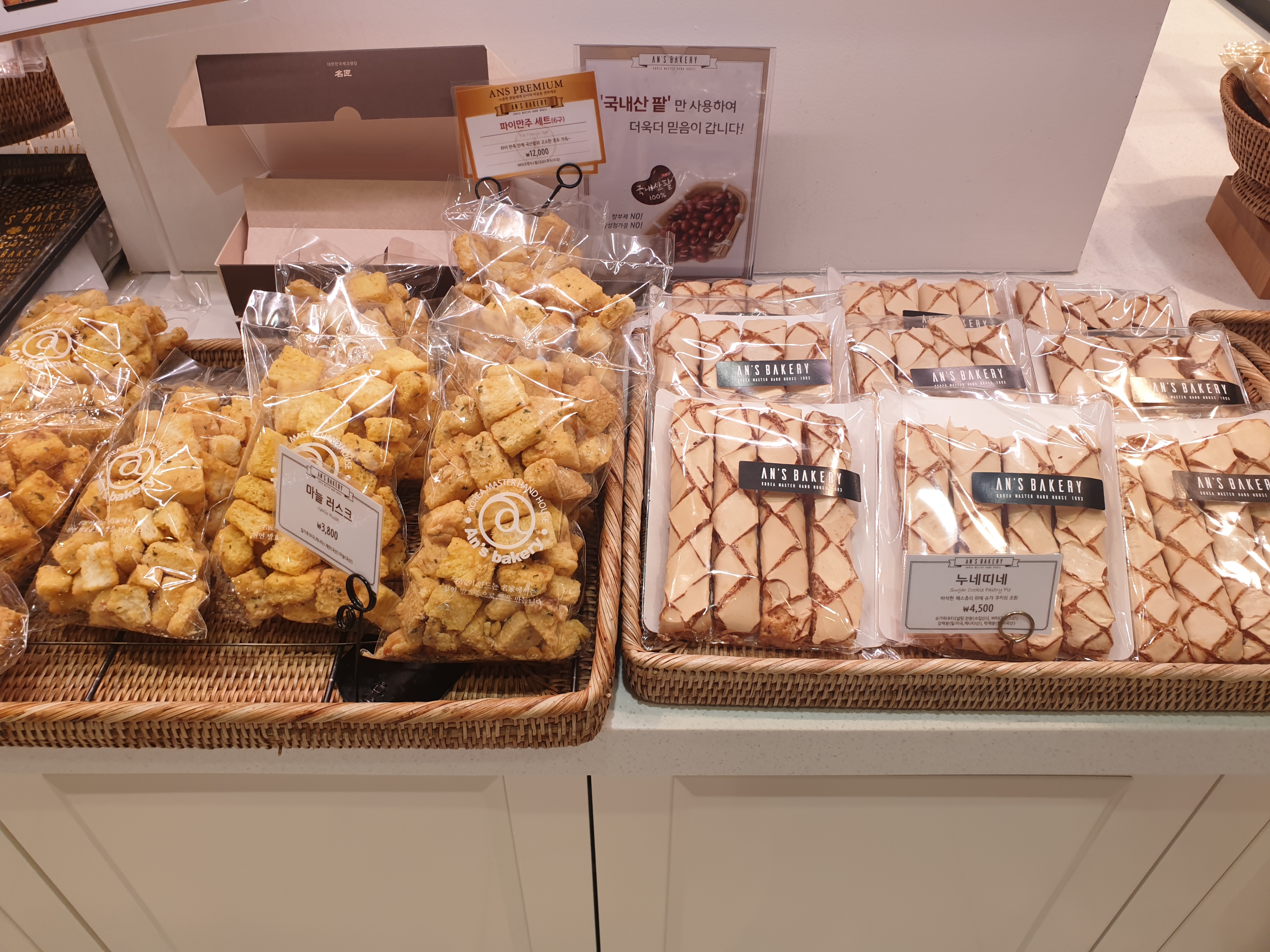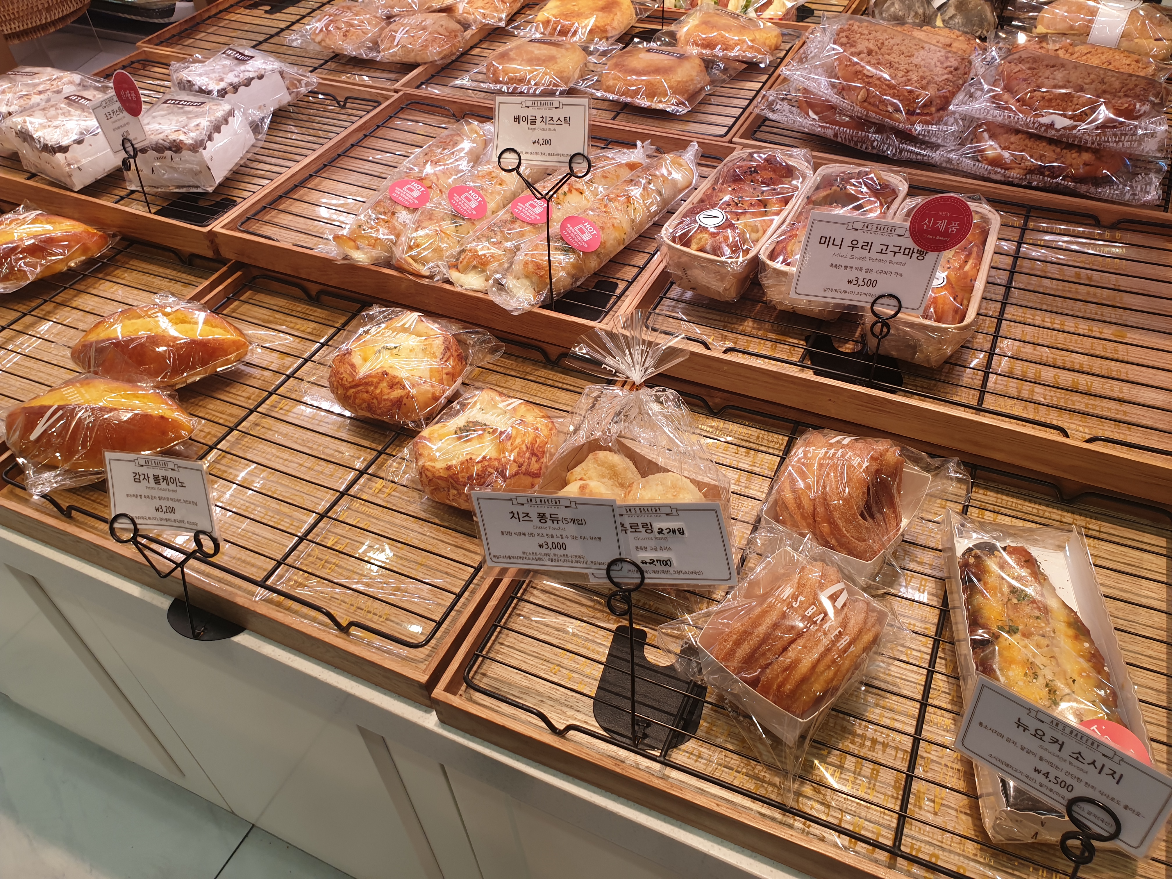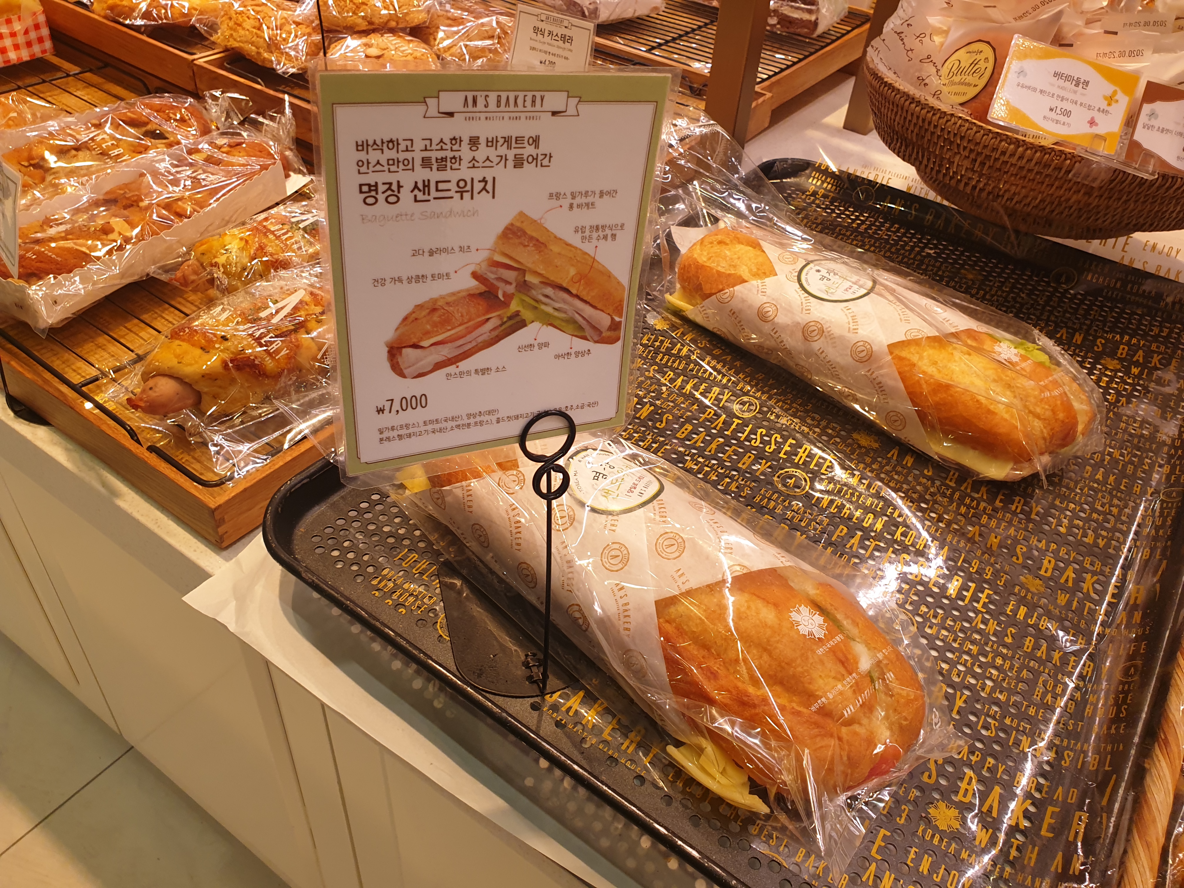 세일하는 품목들은 따로 입구쪽에 진열되어있었어요. 유통기한이 짧은 것들 위주로 세일 하는 듯 했습니다. 할인이 안되는 제품들도 꽤 있더라구요. 안스베이커리의 대표메뉴인 명란바게트도 있더라구요.