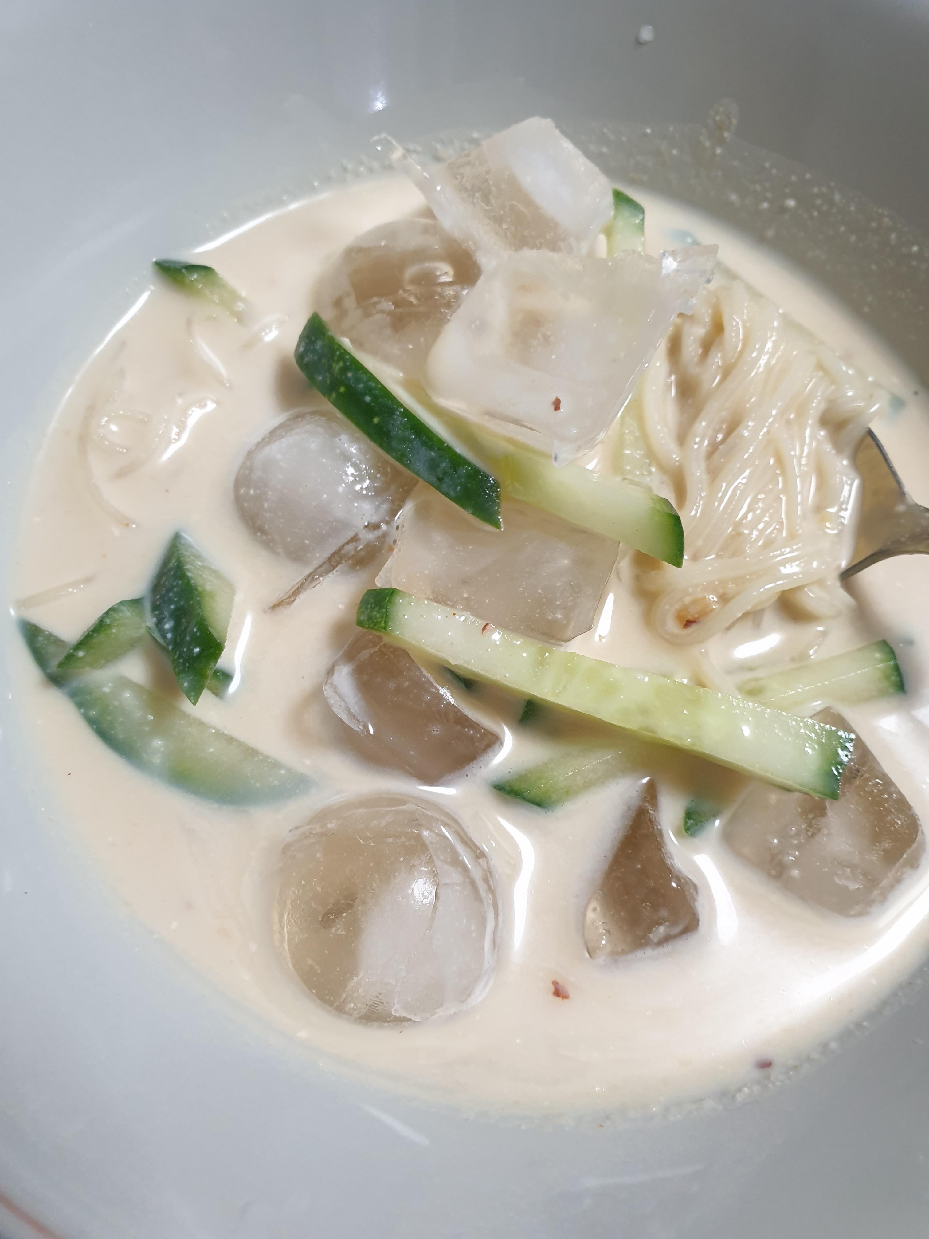 오이와 얼음까지 넣었더니 진짜 제법 콩국수 같아졌어요. 두부의 담백함과 콩가루의 고소함이 잘 살아서 기대이상의 맛 이었습니다. 지금까지 콩국수를 만들려면 콩을 한참 불리고 갈아서 걸러내고 참 번거로운 과정이었는데 이렇게 초간단 레시피가 있으니 앞으로는 쉽게 자주 해먹을 것 같아요. 한가득 만들어서 냉장고에 넣어두고 간식으로 한잔씩 마셔도 좋을 것 같아요.