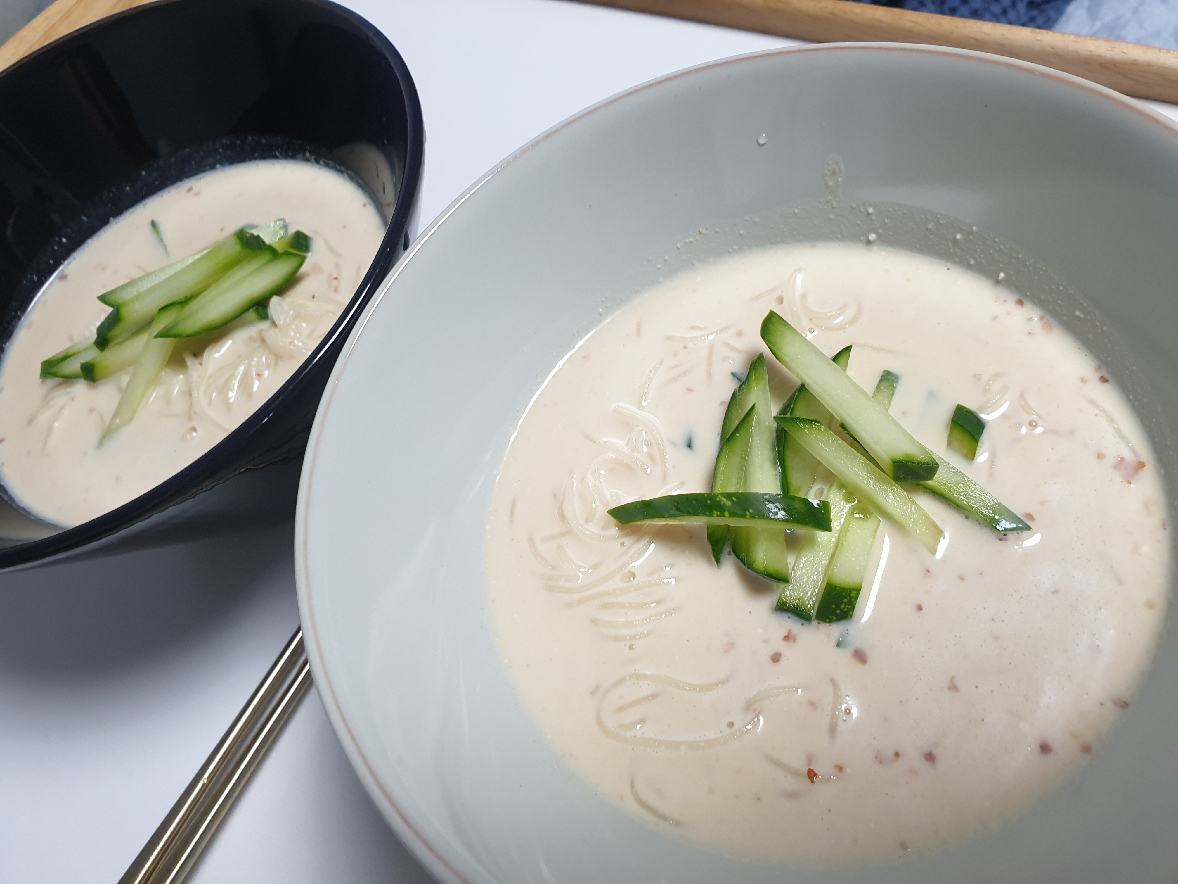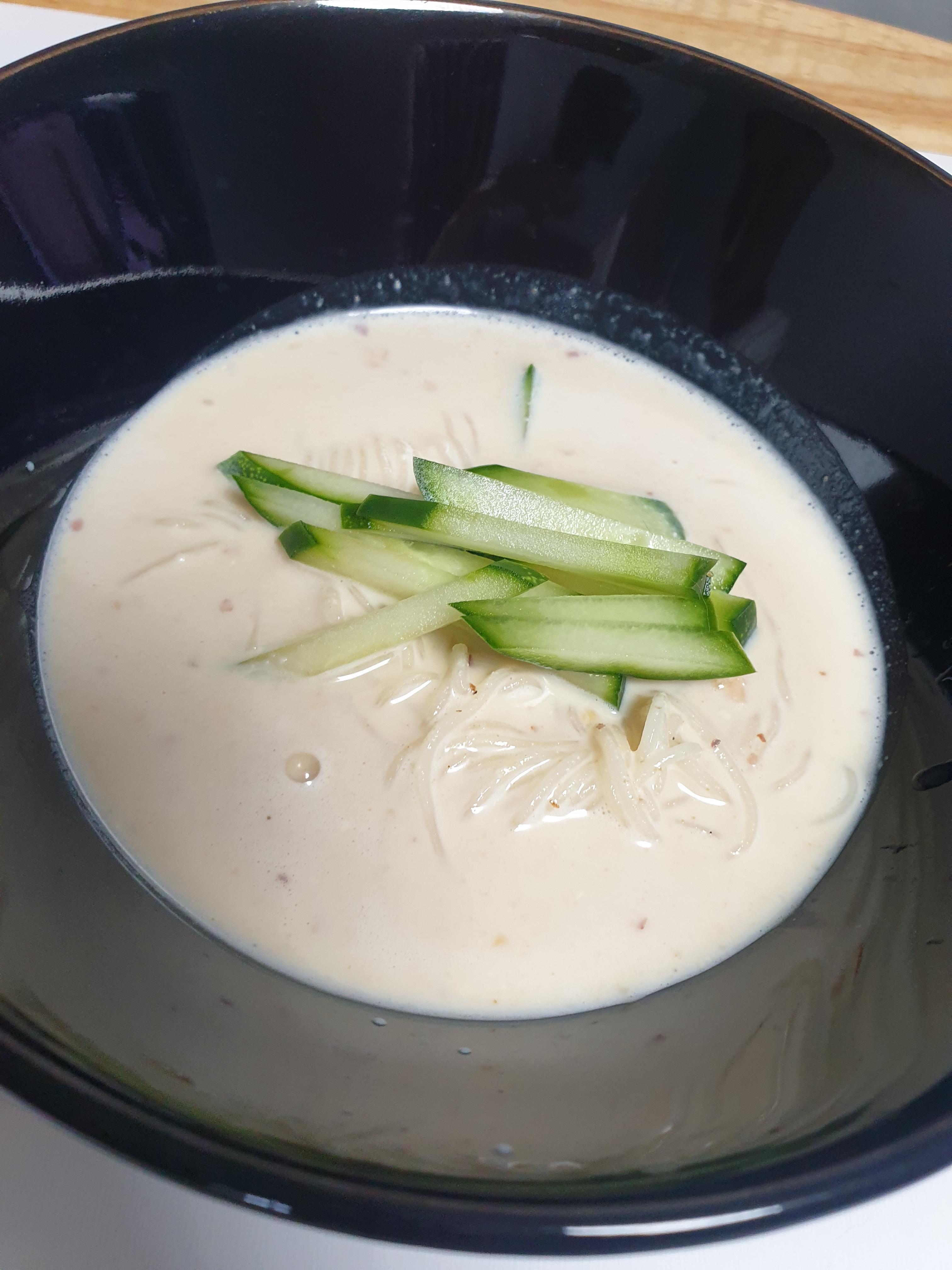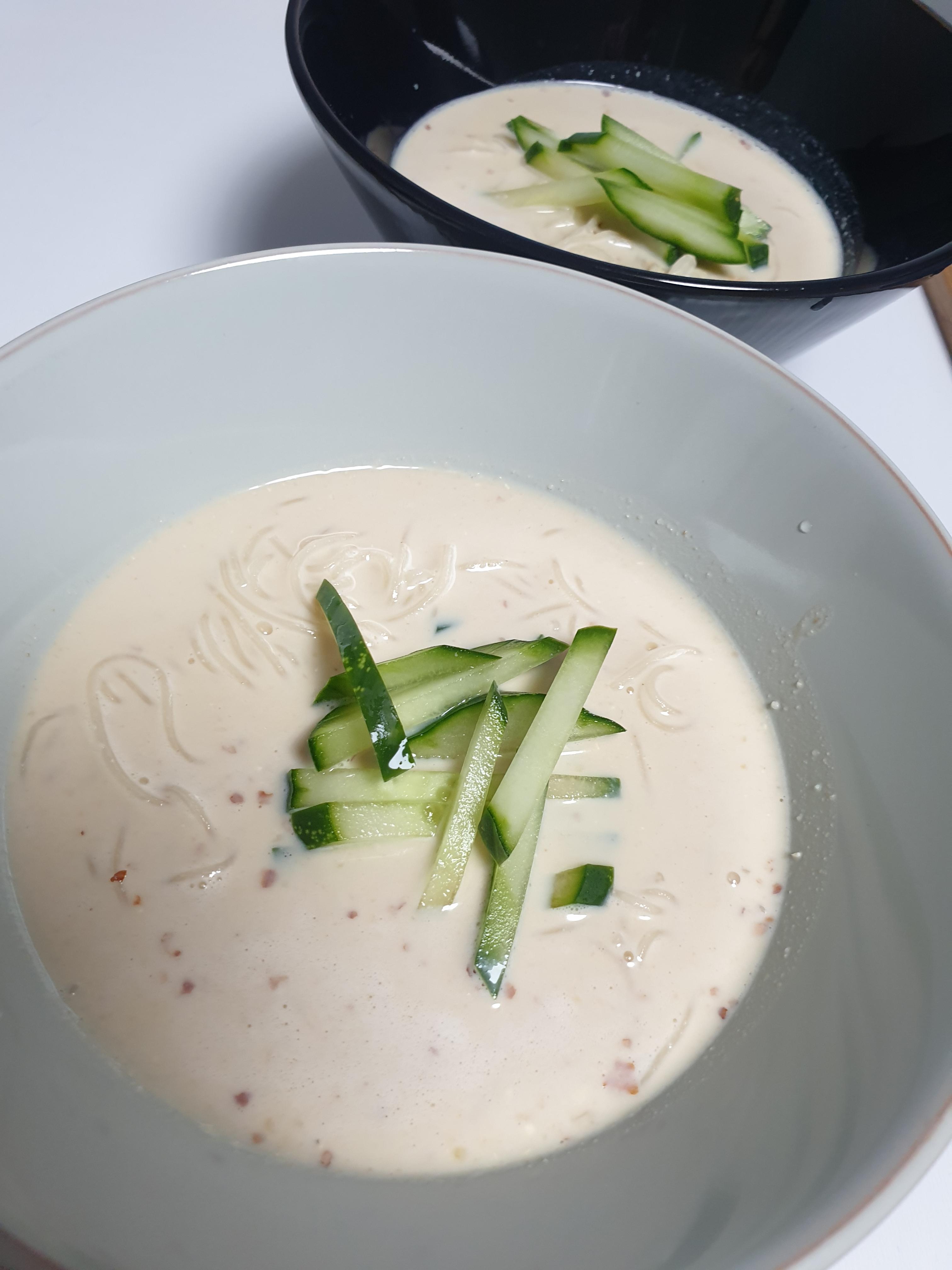 여름에는 이 콩물에 얼음과 우뭇가사리만 넣어서 먹어도 꿀맛이죠. 데워서 콩국으로 먹어도 되지요. 얼마전 포항에 갔을때는 시장에서 이콩물을 따뜻하게 데워서 도너츠를 잘게 썰어서 넣어주신걸 먹어봤었는데 완전 별미더라구요. 오늘은 콩물에 소면을 삶아넣어서 콩국수를 만들어 봤습니다.