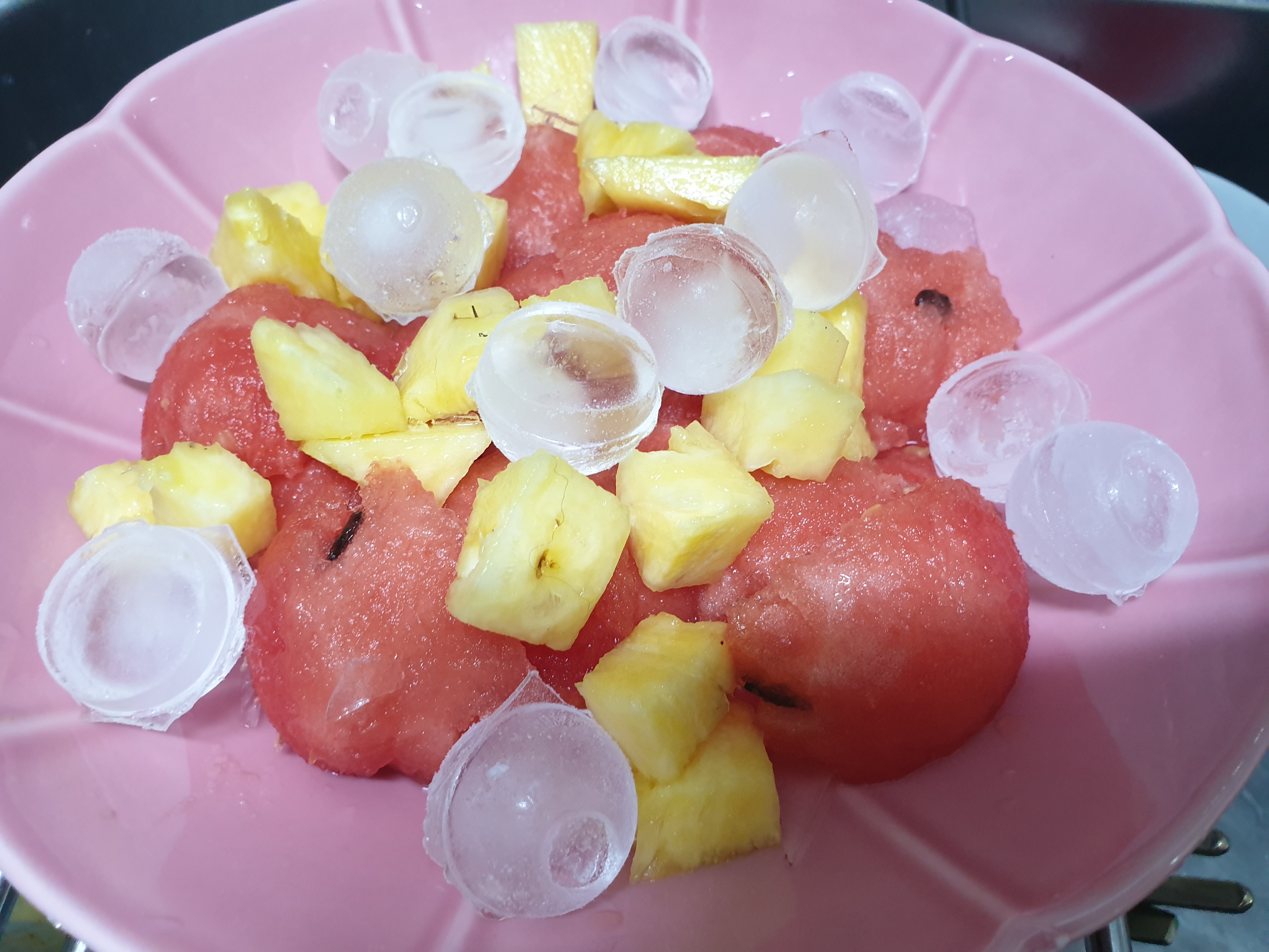 집에있는 최대한 동그란 숟가락으로 수박속을 동그랗게 파내주었습니다. 네모낳게 잘라도 되지만 화채는 왠지 동그랗게 잘린게 맛있어보이더라구요. 파인애플도 먹기좋게 잘라주었습니다. 후르츠칵테일이나 다른 과일들을 추가로 넣어주어도 좋습니다.