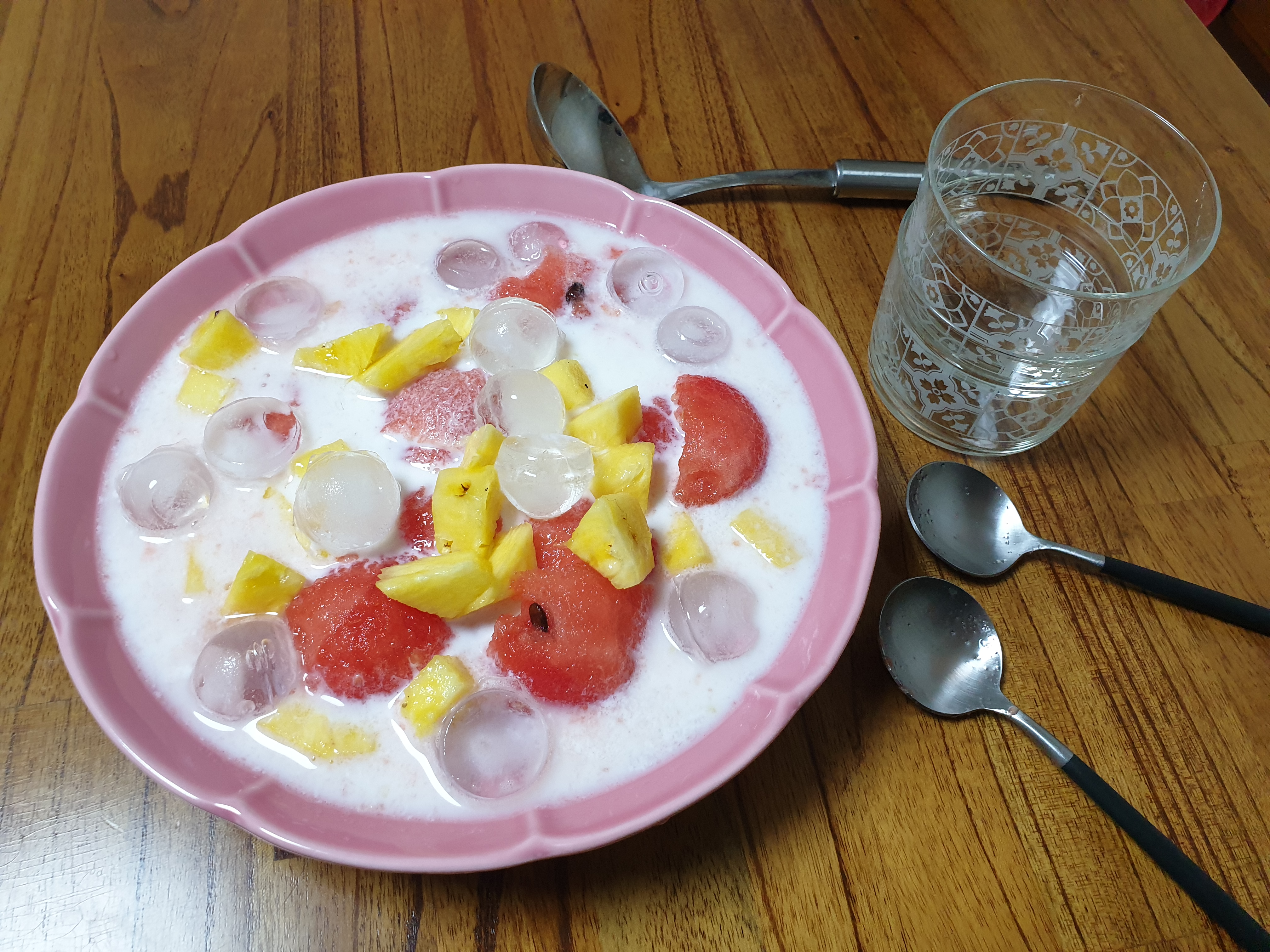 동그란 수박에 동그란얼음과 파인애플 조각을 넣어주고 밀키스를 적당히 부어주었습니다. 사이다와 밀키스 중에 고민했는데 남편이 밀키스를 강력하게 추천 하더라구요. 약간의 우유와 꿀도 추가 해주었습니다. 화채는 하얗고 뽀얘야 맛있어보인다고 하네요.