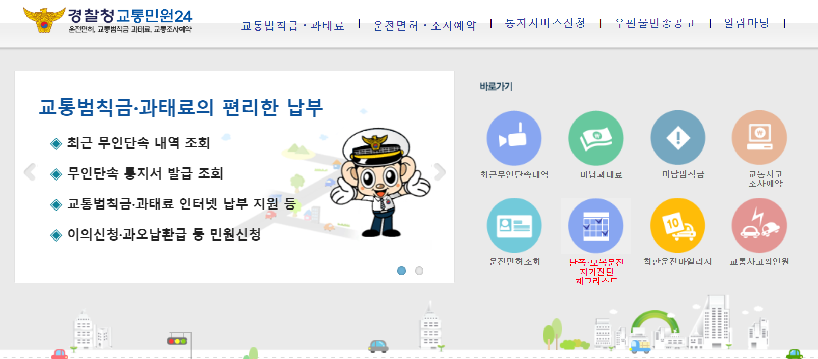 사고까지는 아니더라도 운전할때 제일 신경쓰이는 것 중 하나가 무인단속 카메라이죠! 카메라들이 워낙 많이 있어서 아차하는 순간 속도위반등의 이유로 찍히기 쉬운데요. 카메라를 통과하는 순간 찍혔는지 아닌지 애매한 상황이 오면 계속 찍혔을까봐 신경쓰이셨던 경험이 있으실거에요. 이럴때 경찰청교통민원24에 접속하셔서 교통범칙금, 과태료를 조회 해보실 수 있습니다. 우편 고지서가 올때까지 마음 졸이지 마시고 바로바로 쉽게 조회 해보세요.