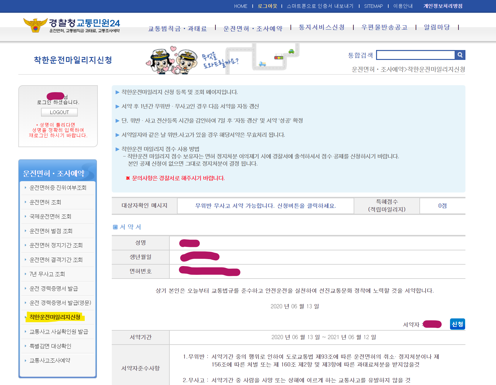 이렇게 해두면 1년 무사고로 10점 마일리지가 쌓이면 자동으로 갱신되어 매년 누적마일리지를 쌓으실 수 있습니다. 혹시라도 사고나 위반사항이있을 경우에는 무효처리되어 추후에 다시 신청을 해주셔야 합니다. 면허 정지처분시에 자동으로 차감되는것은 아니고 경찰서에 출석하여 점수공제신청을 해주셔야 합니다.
