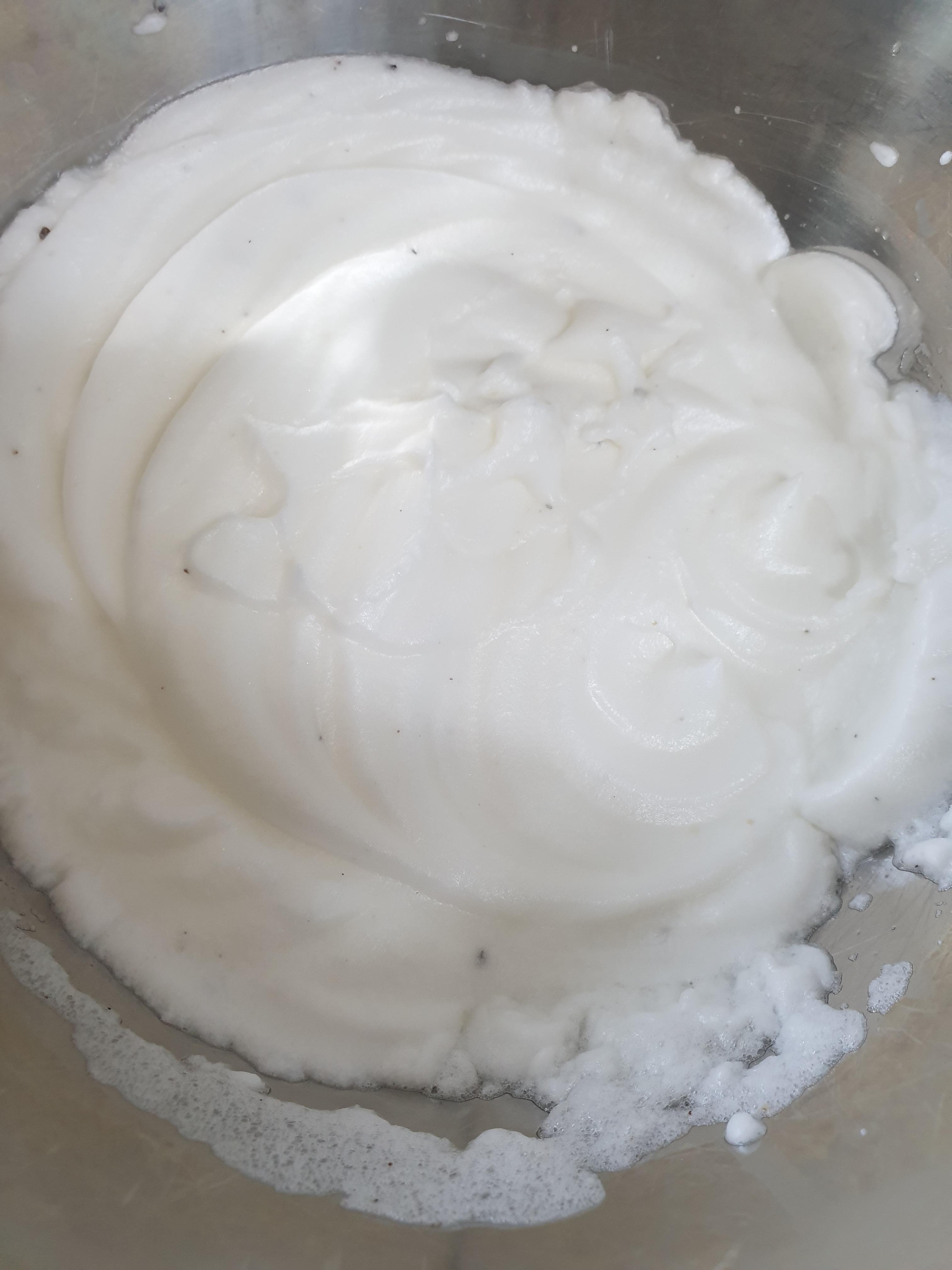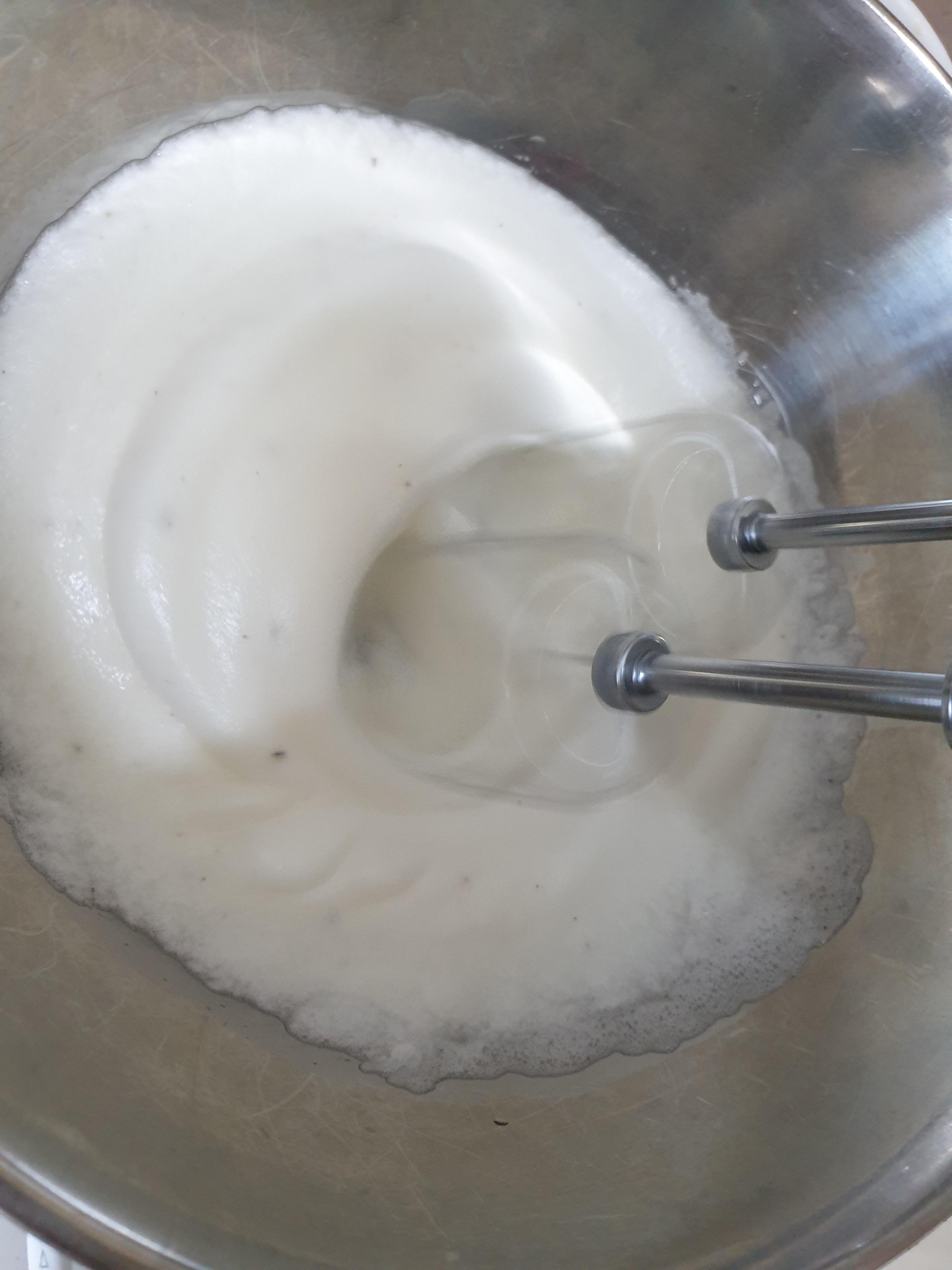 가끔 티비에 보면 손으로 저어서 흰자 머랭치기를 하시는 분들도 계시던데 저는 도저히 손으로는 못하겠더라구요. 계란흰자에 소금약간과 후추약간을 넣고 거품기로 머랭을 만들어 줍니다. 머랭이 몽글몽글하게 쌓이기 시작하면 머랭치기는 완성 됩니다.