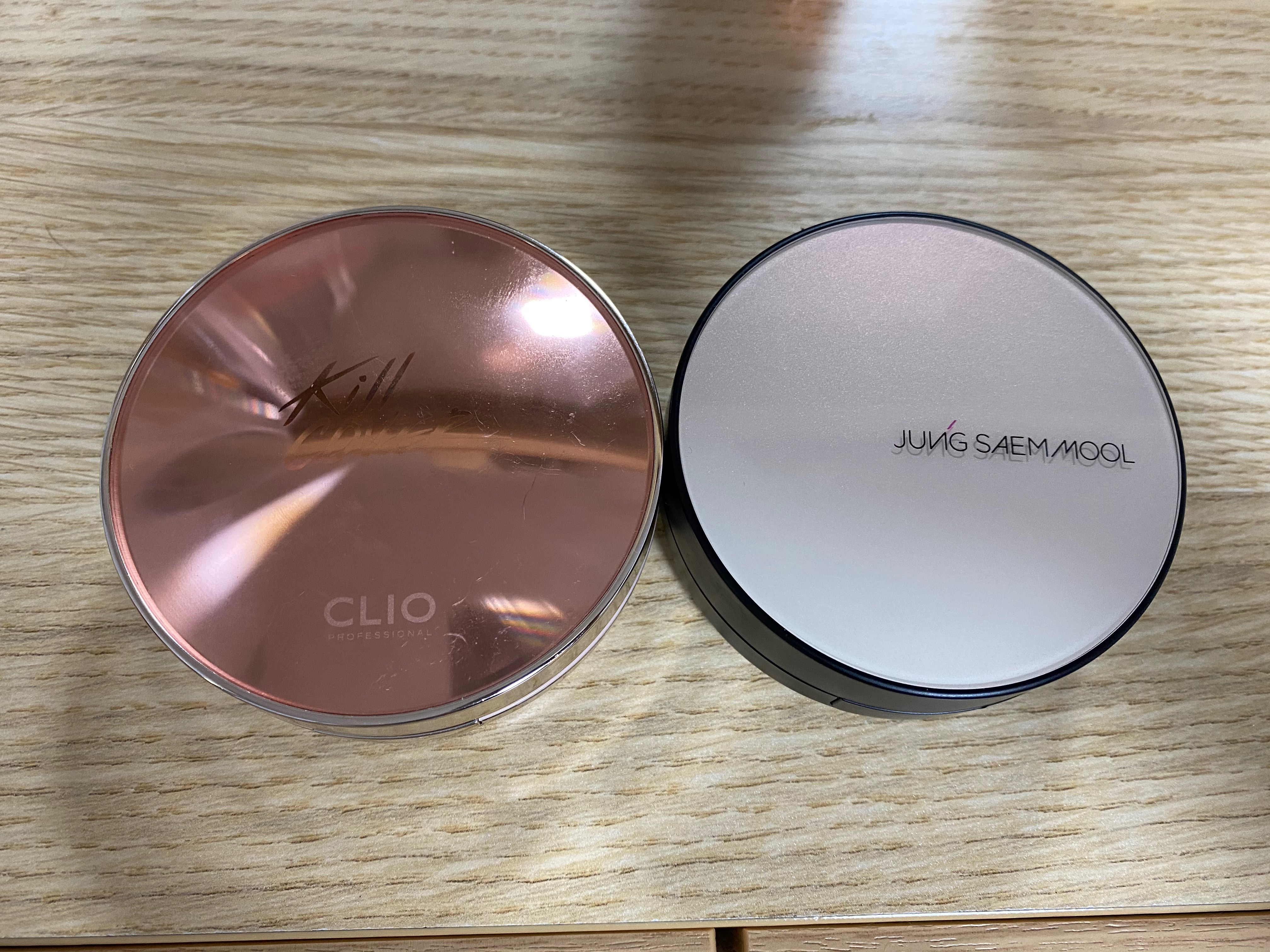 왼쪽이 클리오 킬커버 광채쿠션 리넨 / 오른쪽이 정샘물 에센셜 스킨누더쿠션 라이트 입니다