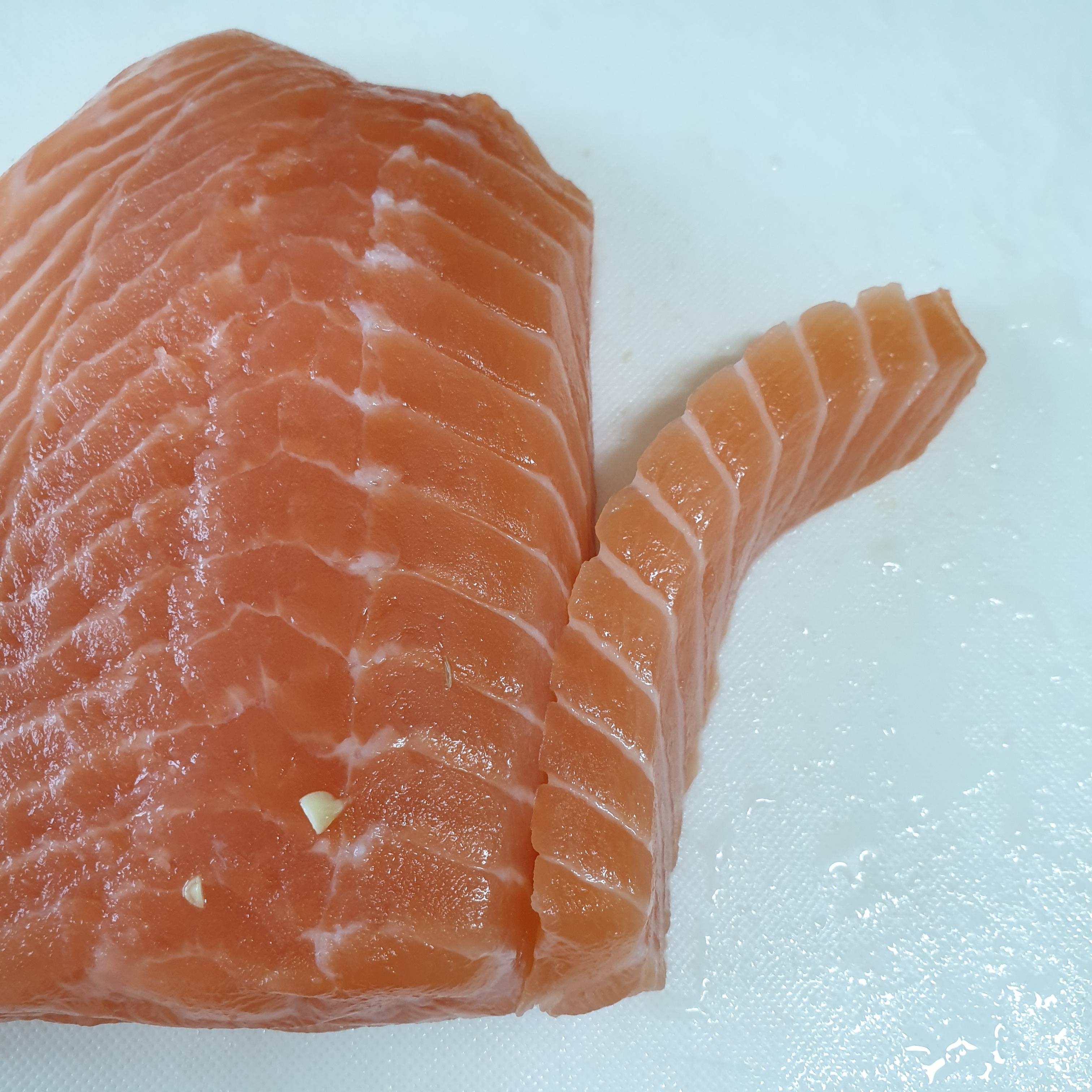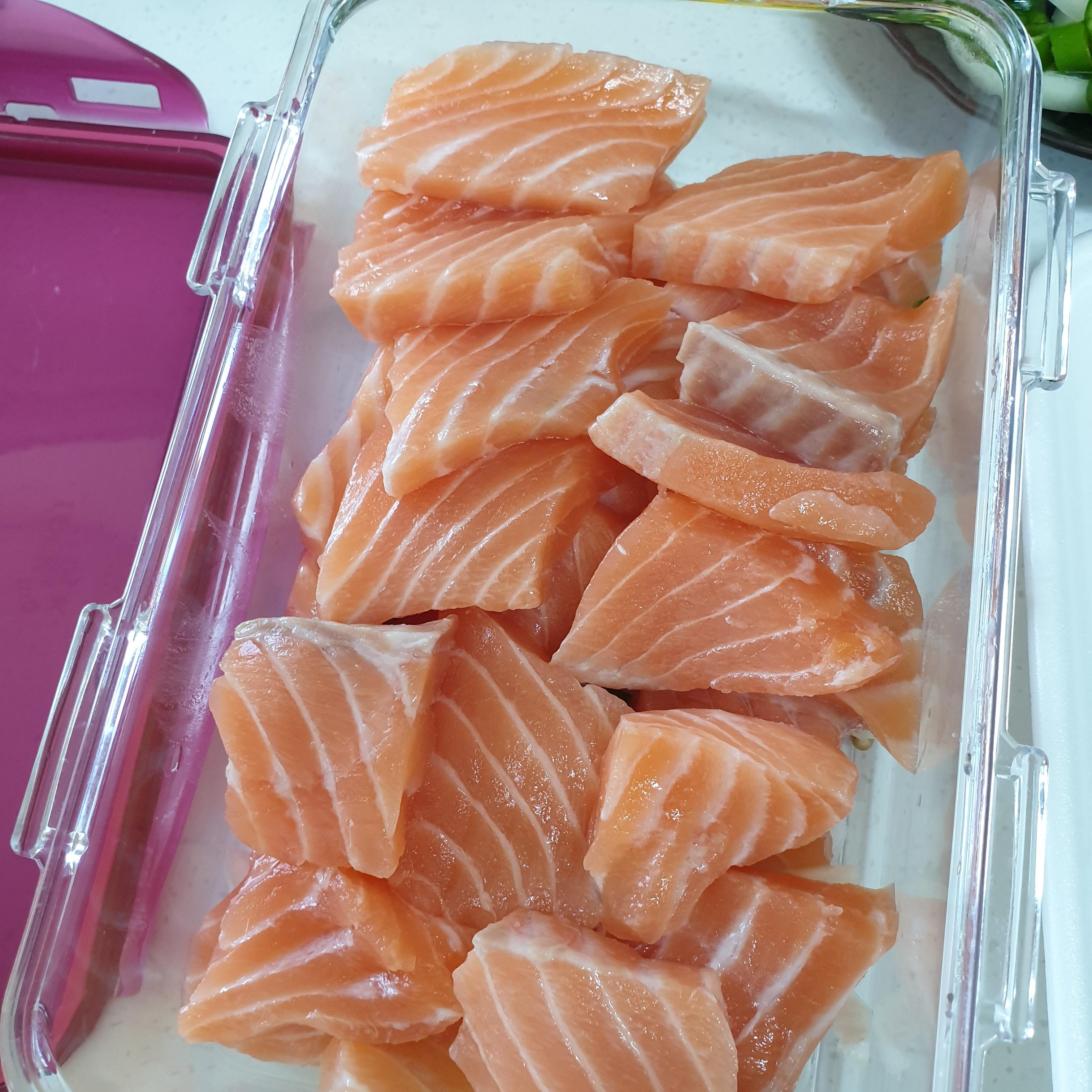 그리고 연어도 도톰하게 썰어서 준비 해줍니다.