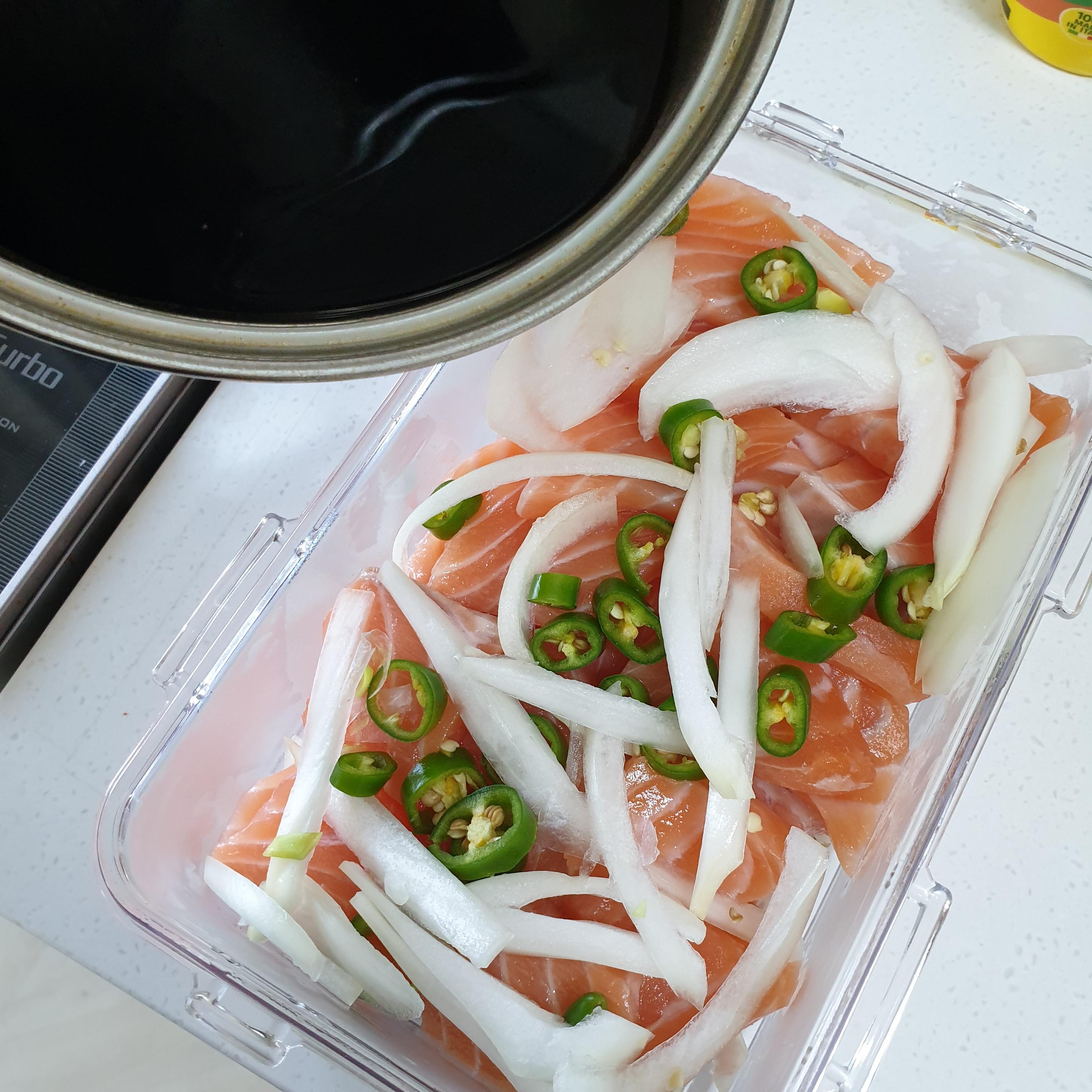 간장이 따듯할 때 넣으면 연어가 익어버릴 수 있으니 다 식었는지 확인 하고 넣어 주세요.