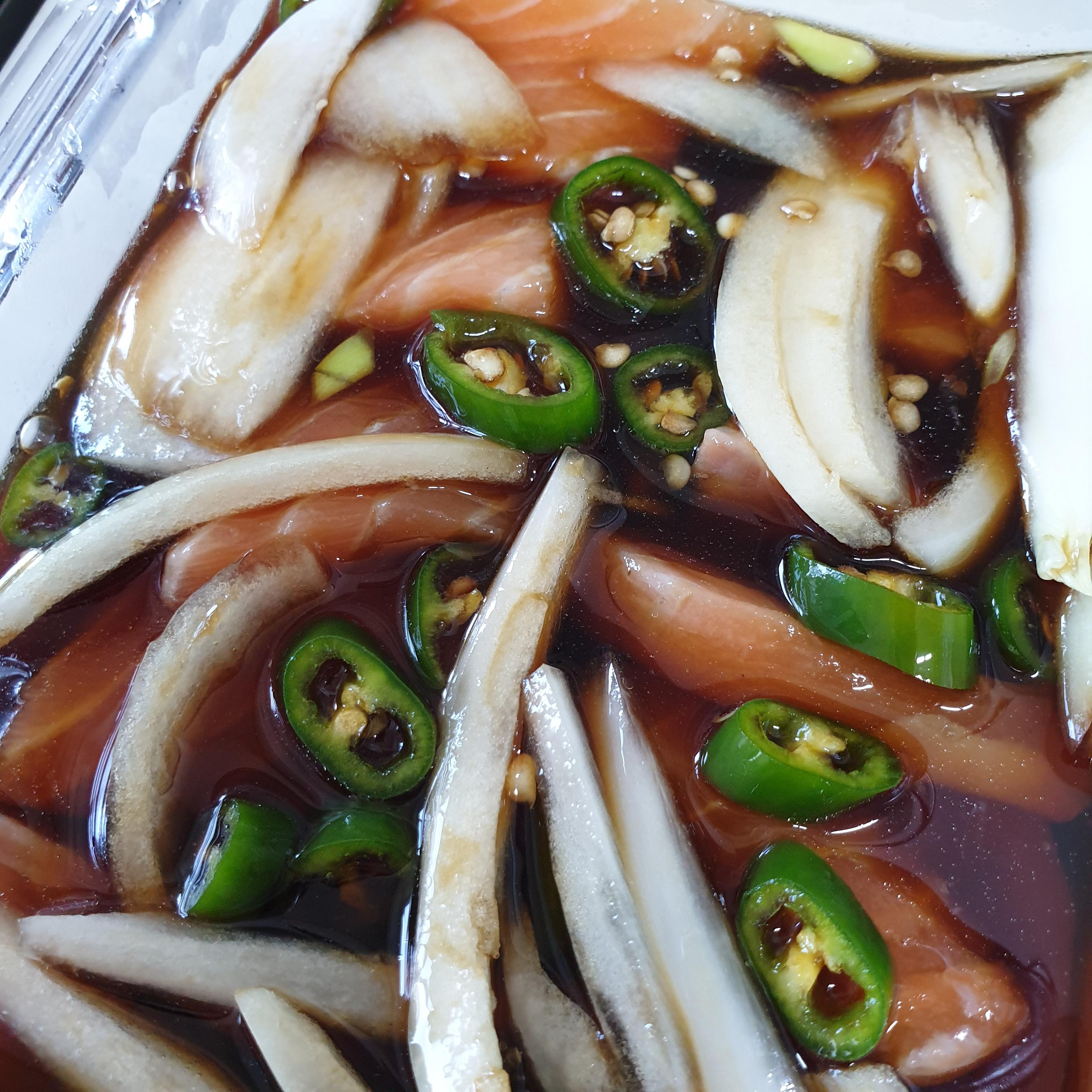 간장, 가쓰오부시장, 설탕, 맛술, 레몬즙, 연어, 양파, 청양고추, 후추
