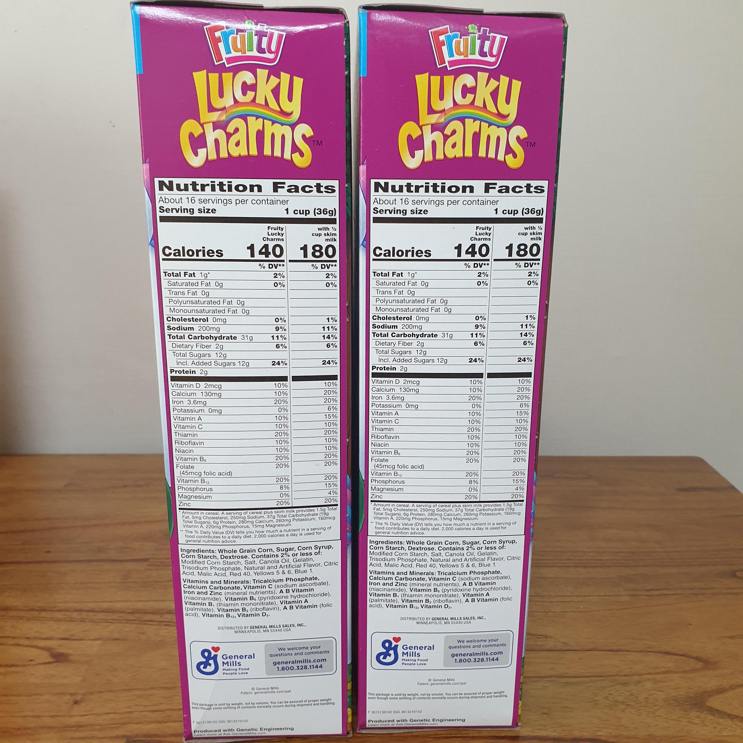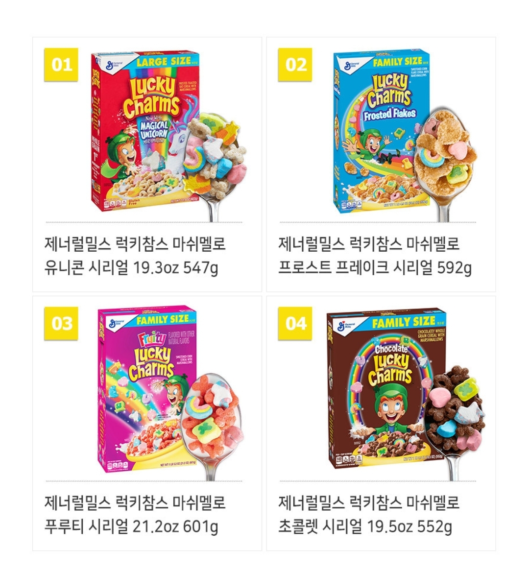 제러널밀스의 럭키참스는 오리지널, 프로스트프레이크, 프루티, 초코으로 구성되어있어요.